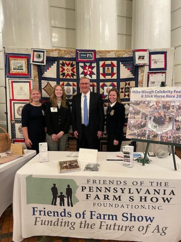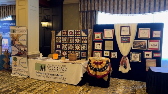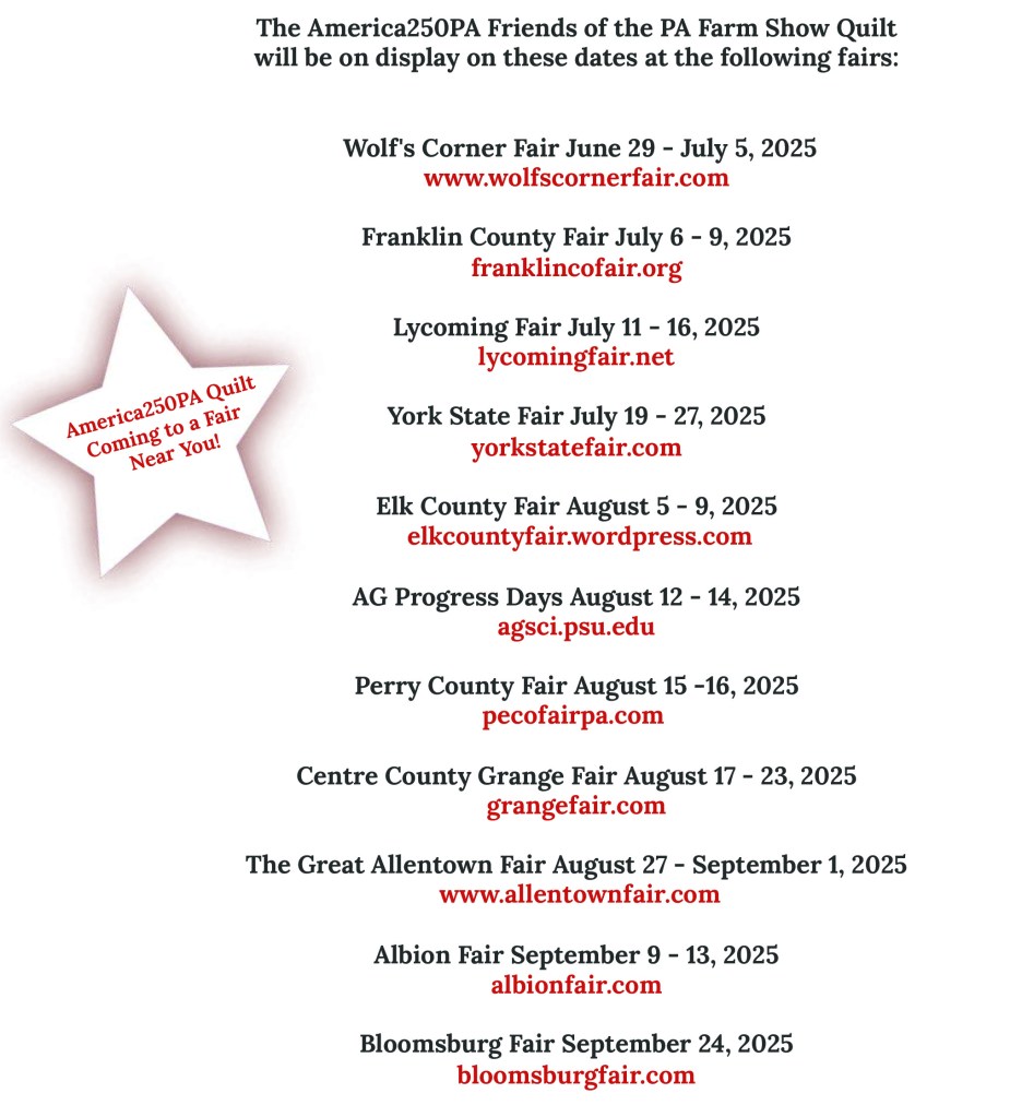 The Cumberland Valley Grange #2104 is spearheading a quilt project to celebrate America250PA and raise funds for the Friends of Farm Show Foundation, Inc. The quilt was displayed at the 2025 PA Farm Show for attendees to participate in hand quilting the top. The finished quilt will be raffled on January 10, 2026 at the PA Farm Show.